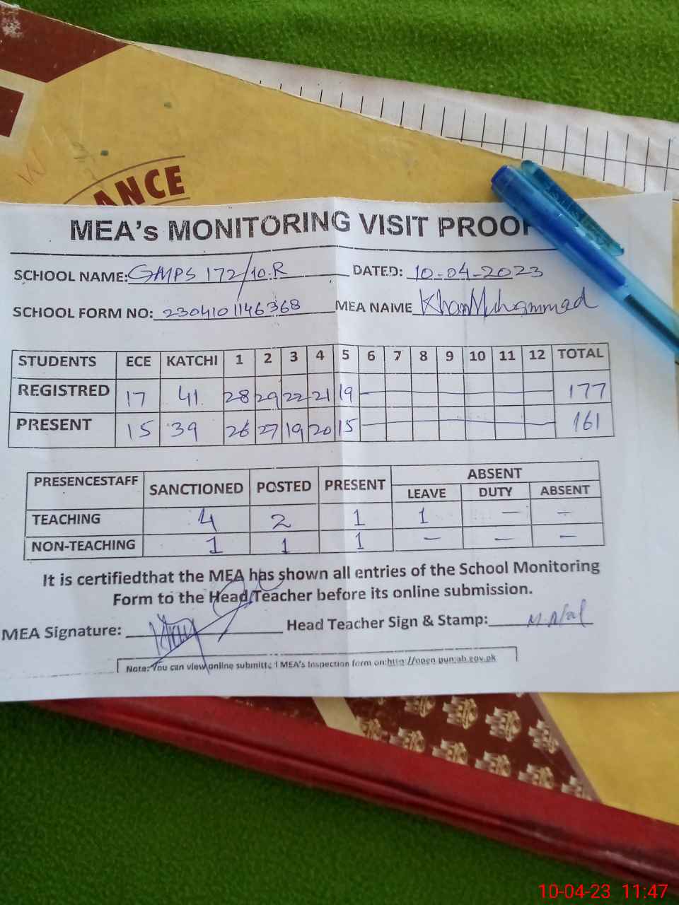 | Attendance Register | Head Teacher | MEA with School | Visit Proof |