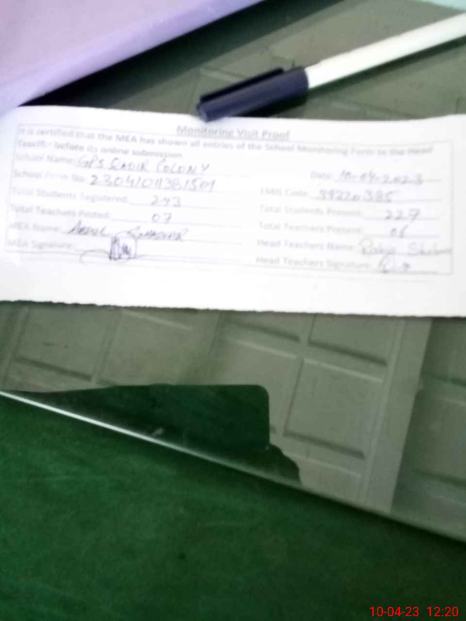 | Attendance Register | Head Teacher | MEA with School | Visit Proof |