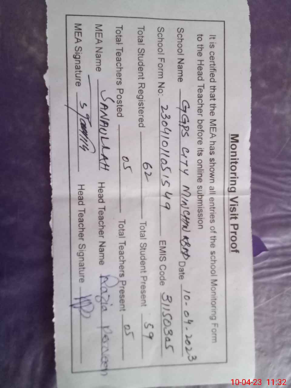 | Attendance Register | Head Teacher | MEA with School | Visit Proof |