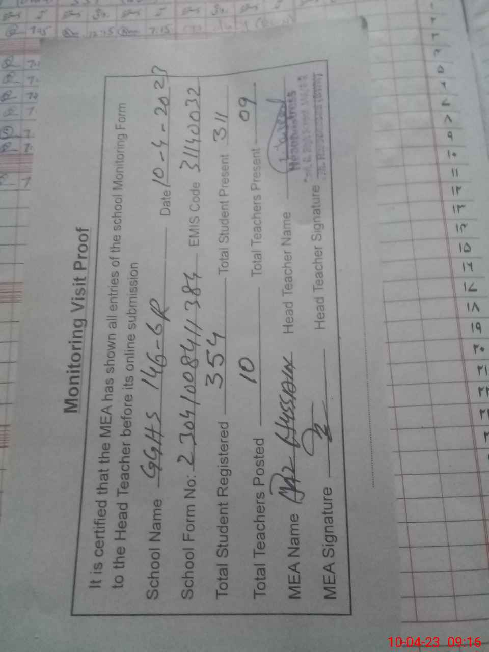 | Attendance Register | Head Teacher | MEA with School | Visit Proof |