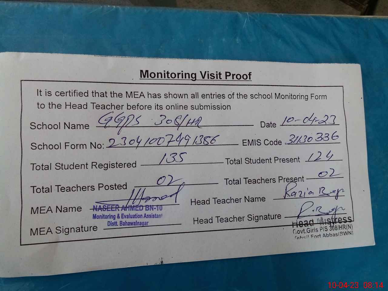 | Attendance Register | Head Teacher | MEA with School | Visit Proof |