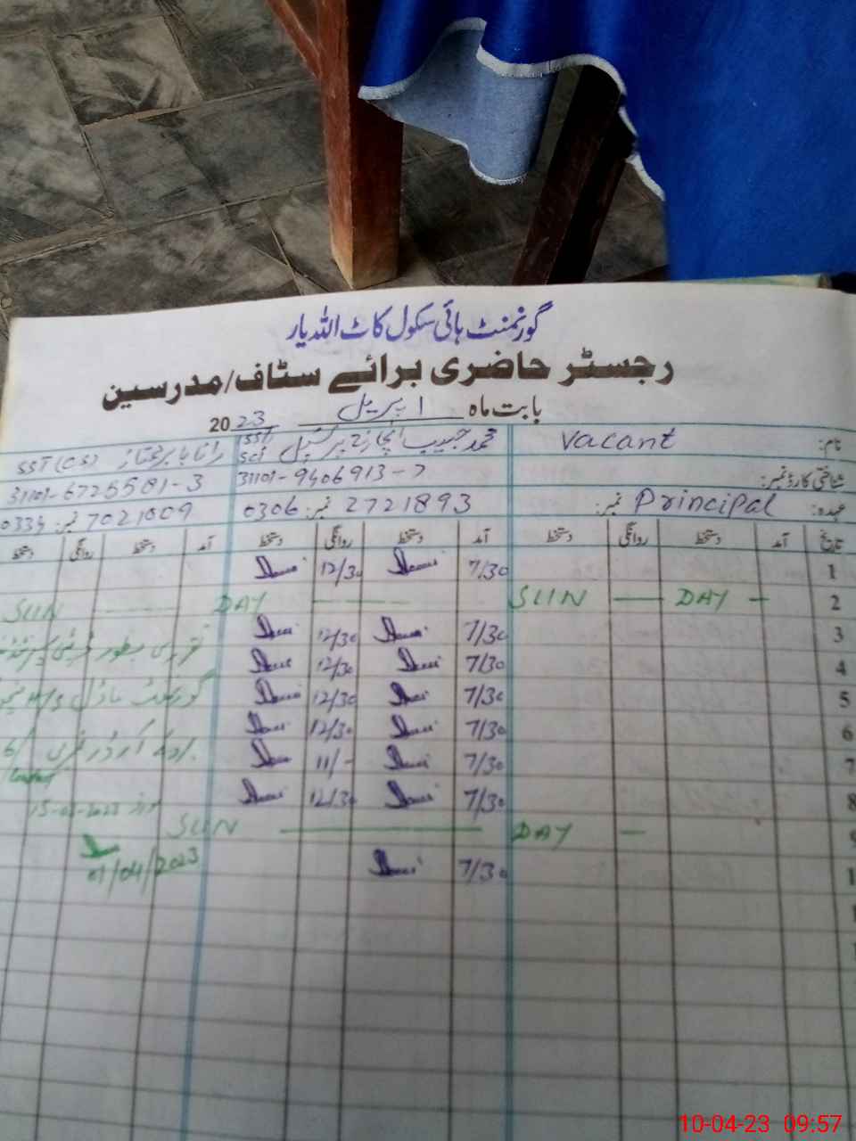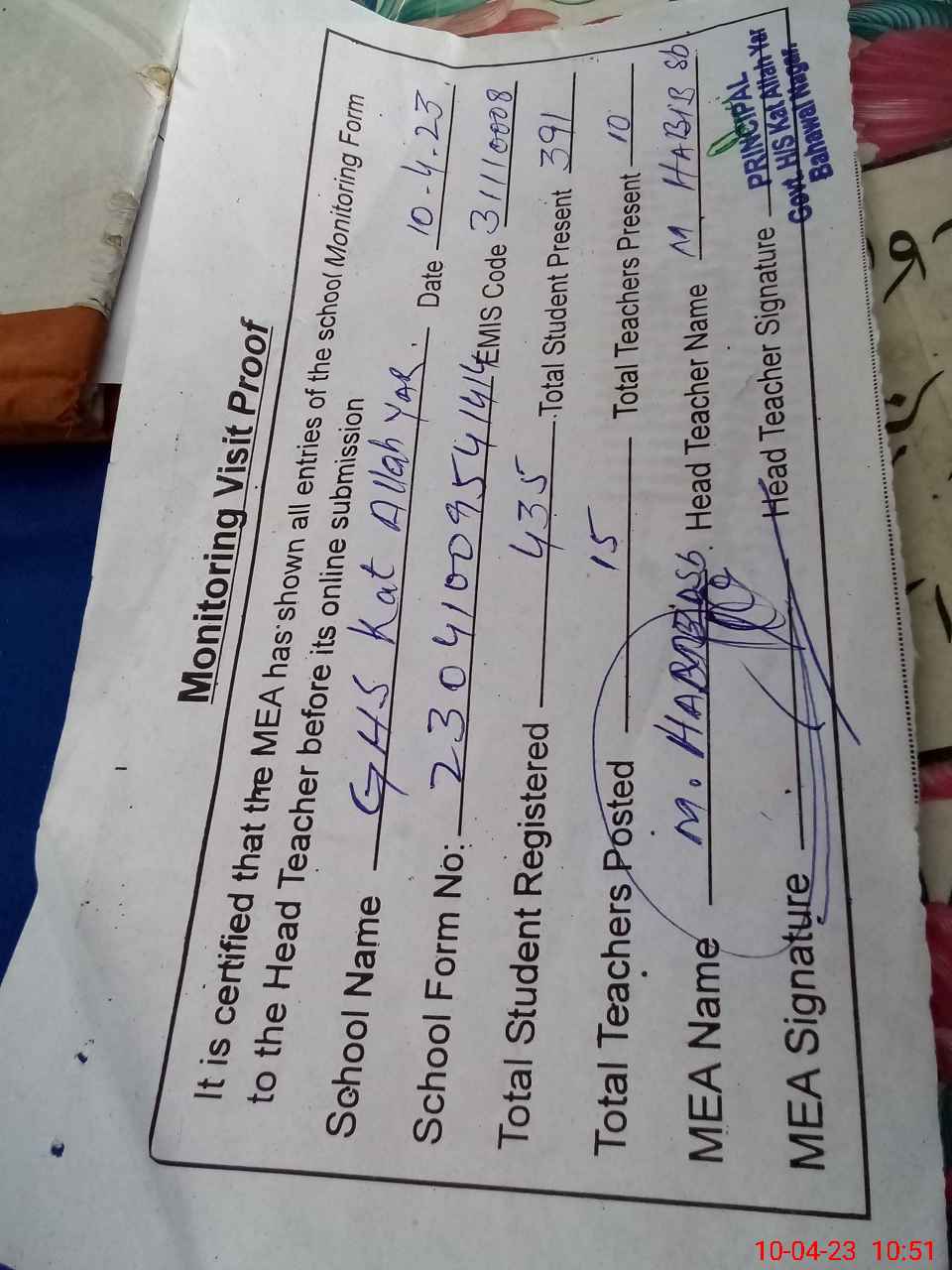 | Name: MU**** HA**** Designation: (School Headmaster's/Headmistress's) SST SCI Phone/Cell Number: 03**** |