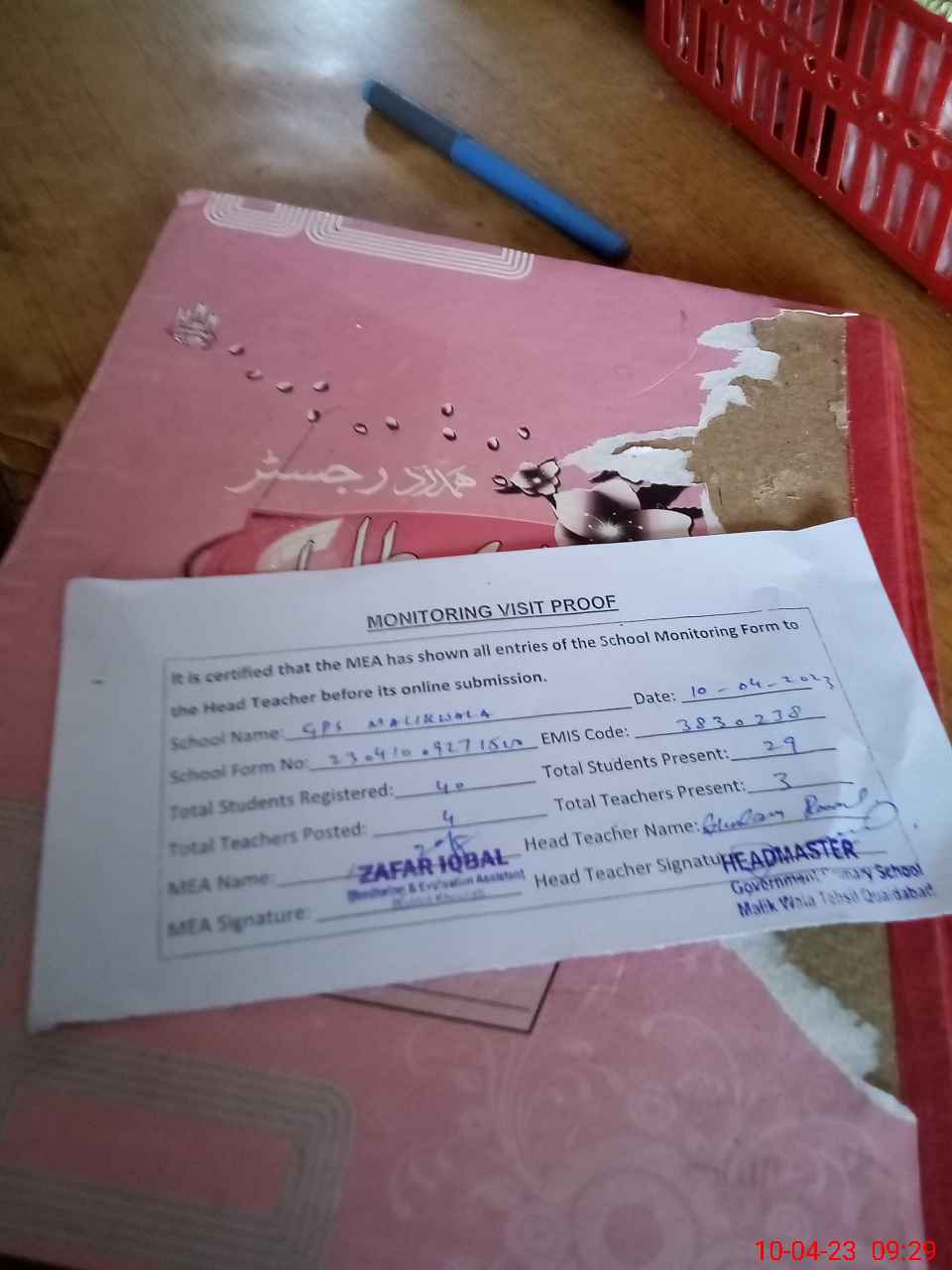 | Attendance Register | Head Teacher | MEA with School | Visit Proof |