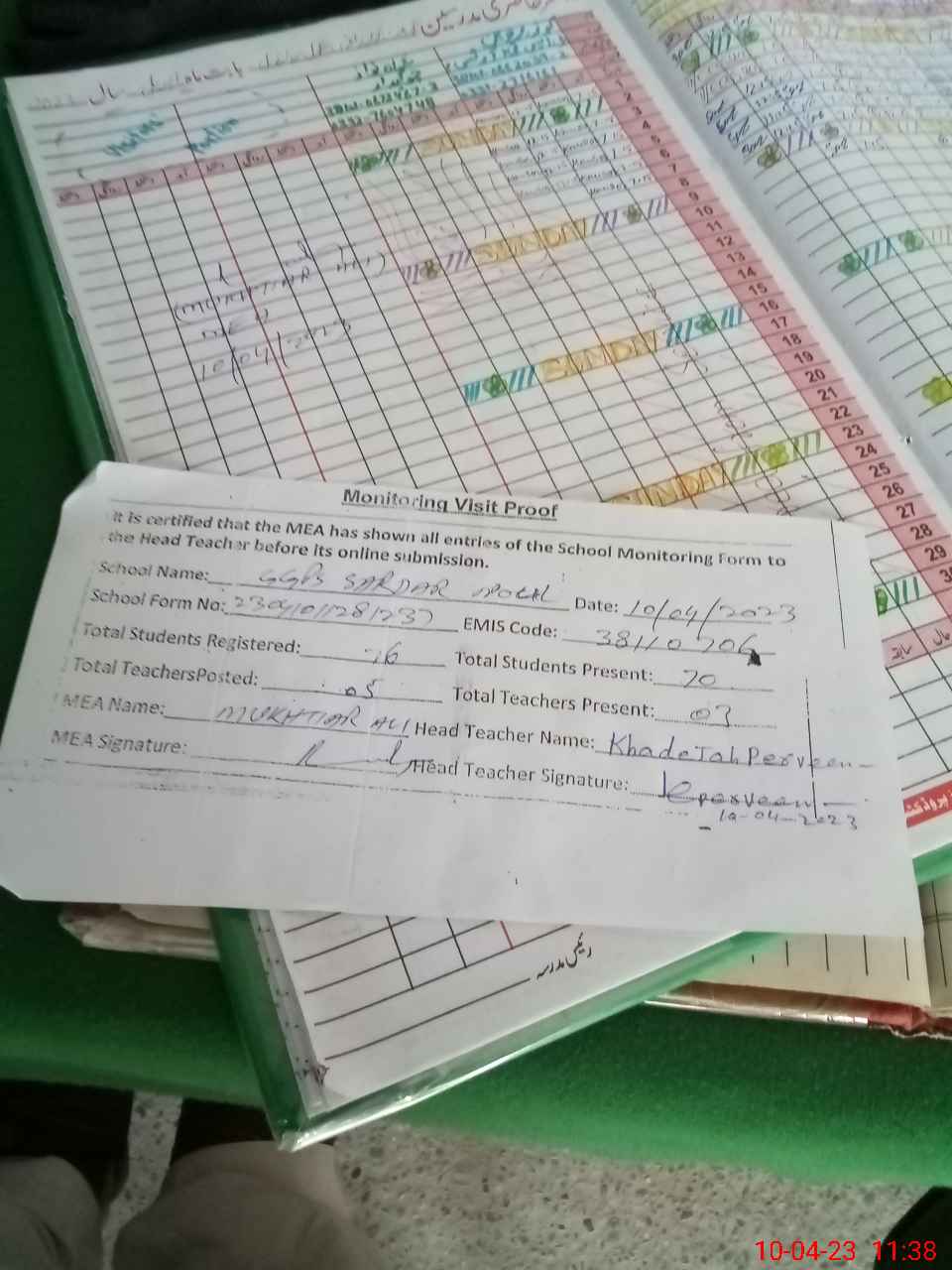 | Attendance Register | Head Teacher | MEA with School | Visit Proof |