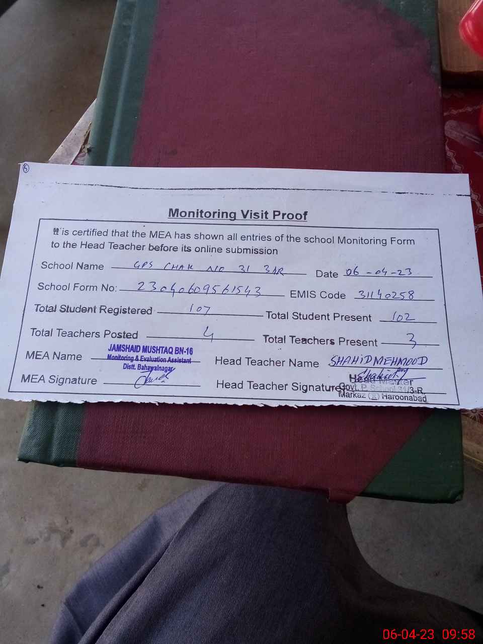 | EMIS Code: 31140258 | Name of School: GPS CHAK NO.31/3-R | |||