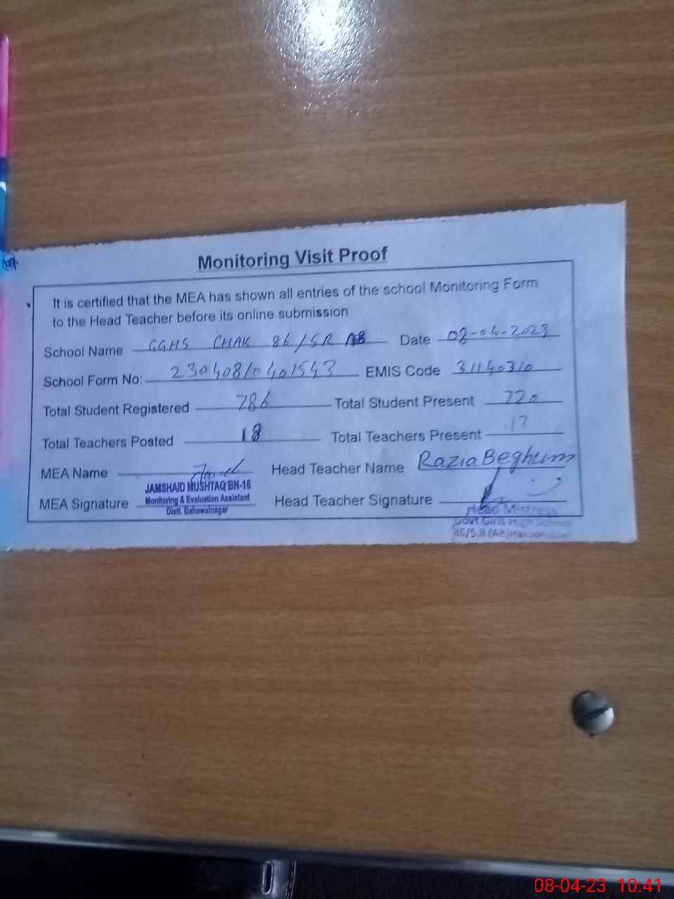 | Certified that this School was Inspected by the Undersigned MEA/DMO Today and the Information Stated Above is as Per Record. | |||||