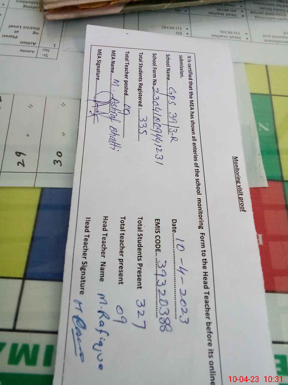 | Attendance Register | Head Teacher | MEA with School | Visit Proof |