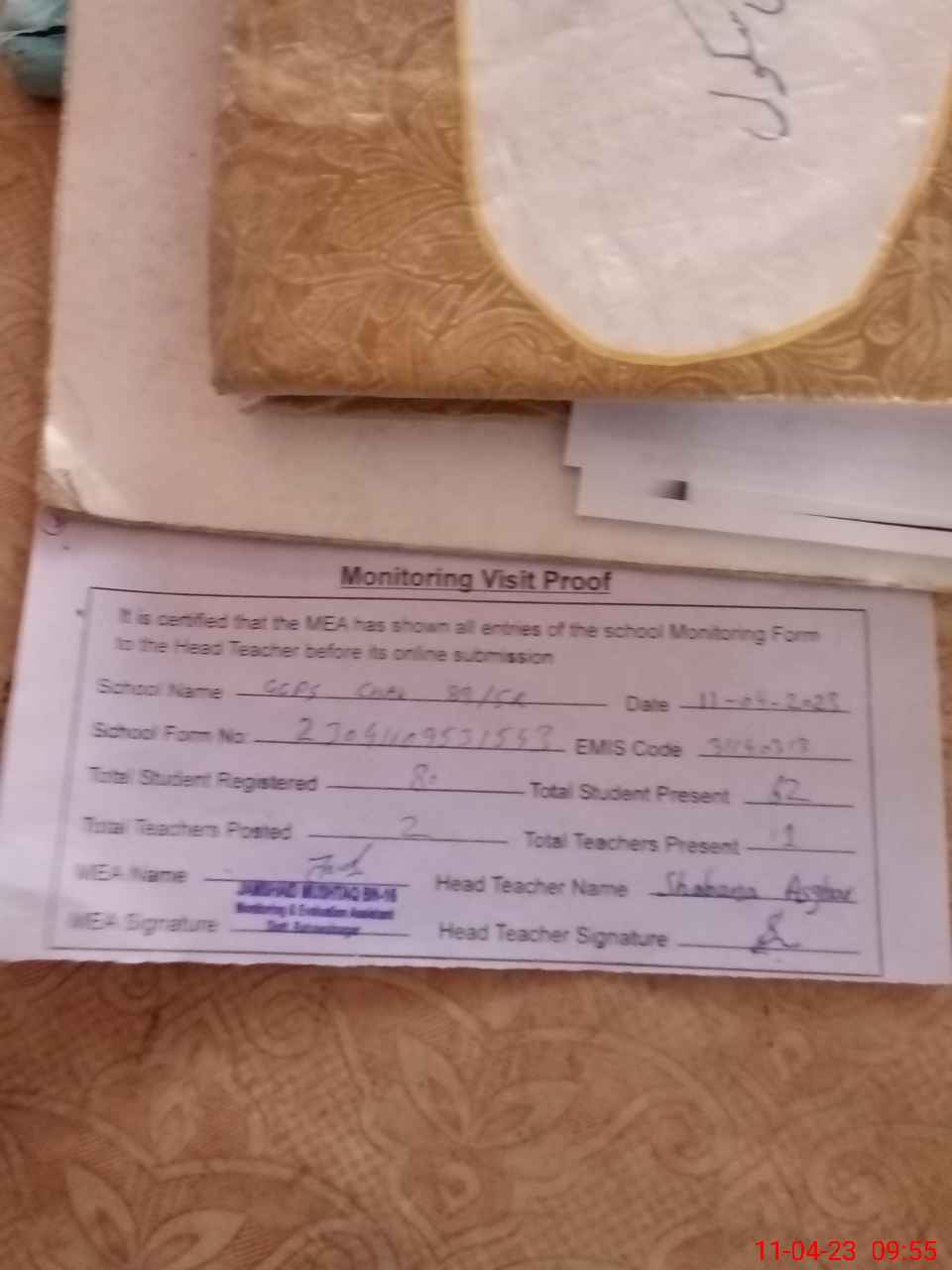 | Attendance Register | Head Teacher | MEA with School | Visit Proof |