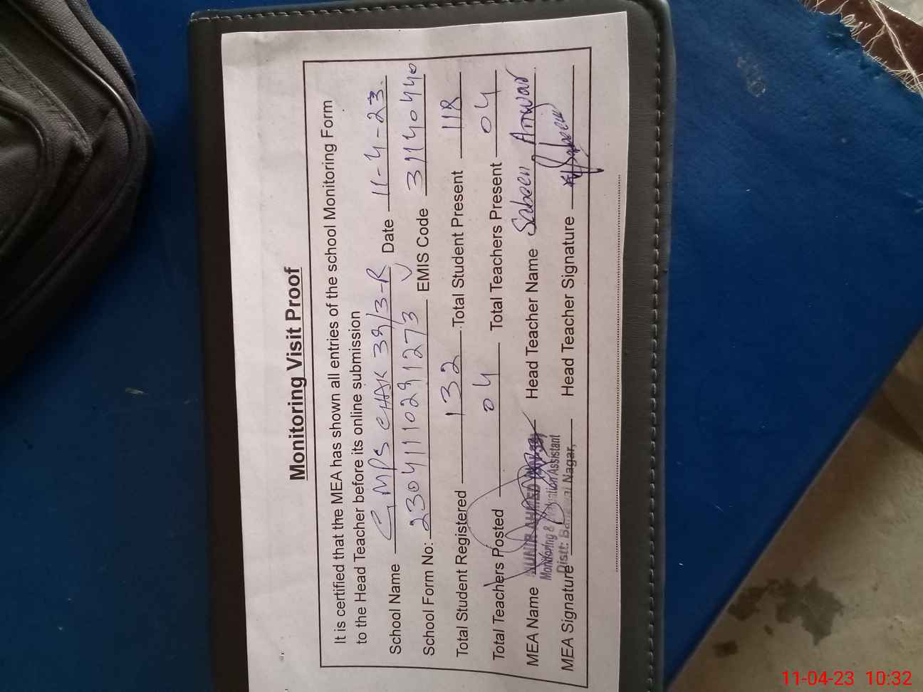 | Attendance Register | Head Teacher | MEA with School | Visit Proof |