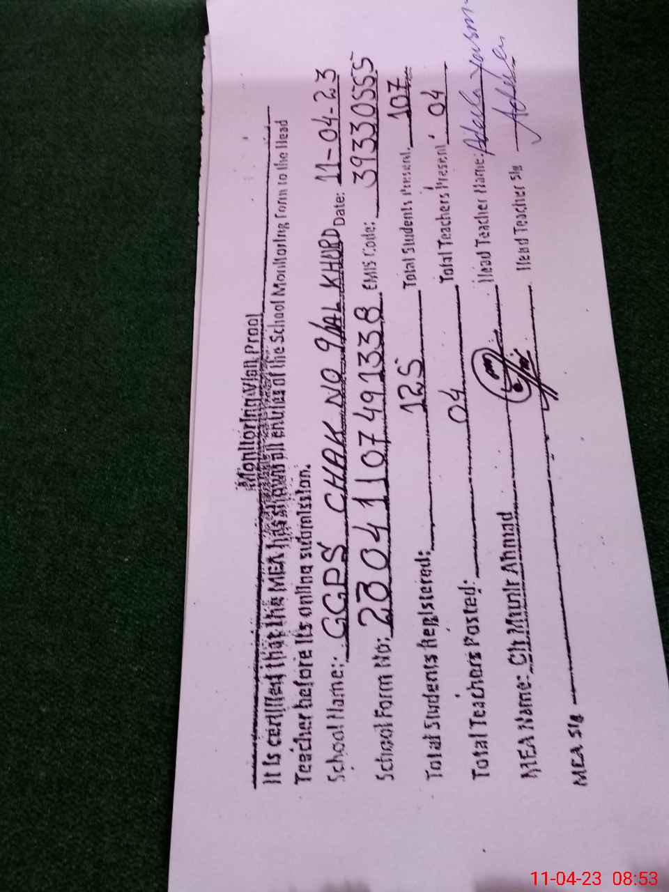 | Attendance Register | Head Teacher | MEA with School | Visit Proof |