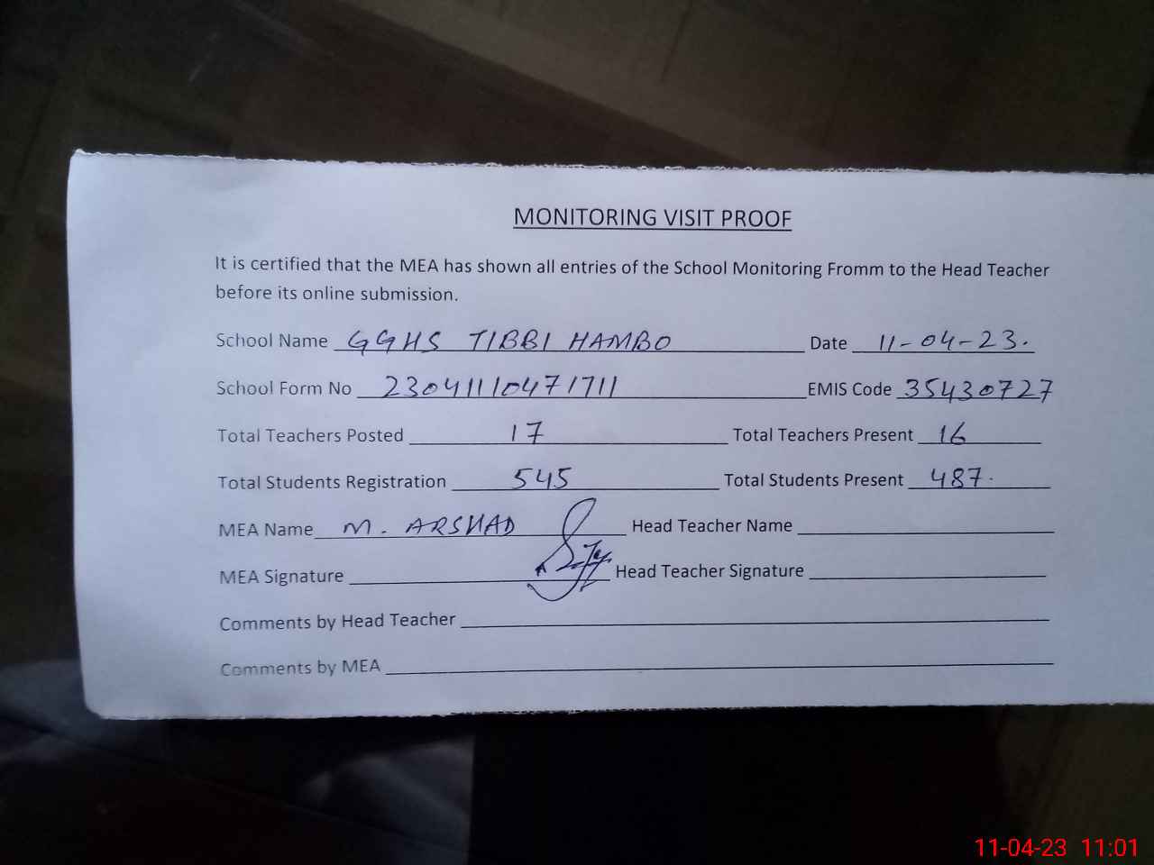 | Attendance Register | Head Teacher | MEA with School | Visit Proof |