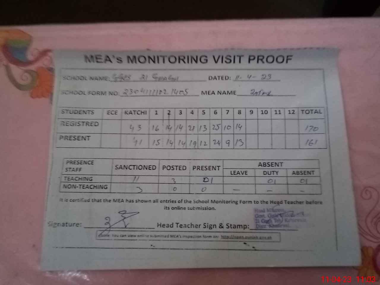 | Attendance Register | Head Teacher | MEA with School | Visit Proof |
