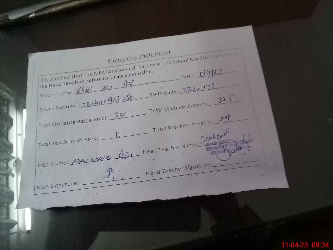 | Attendance Register | Head Teacher | MEA with School | Visit Proof |