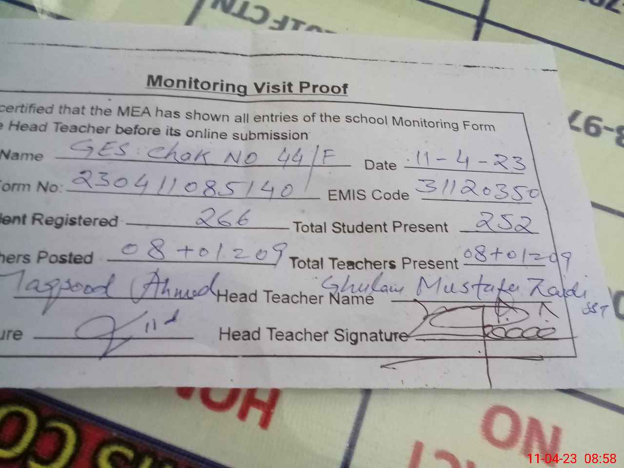 | EMIS Code: 31120350 | Name of School: GES CHAK NO 44/F | |||