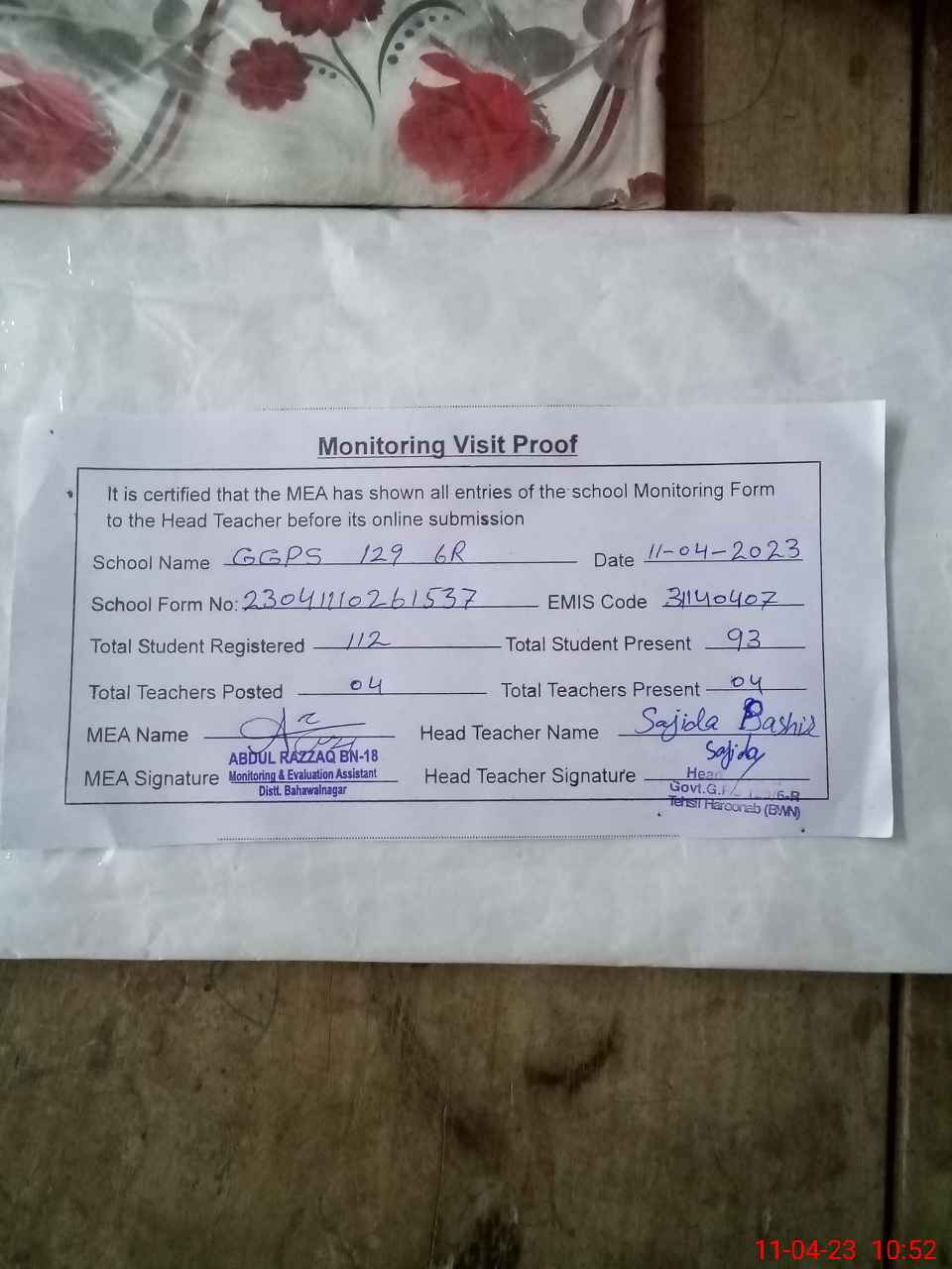 | Attendance Register | Head Teacher | MEA with School | Visit Proof |