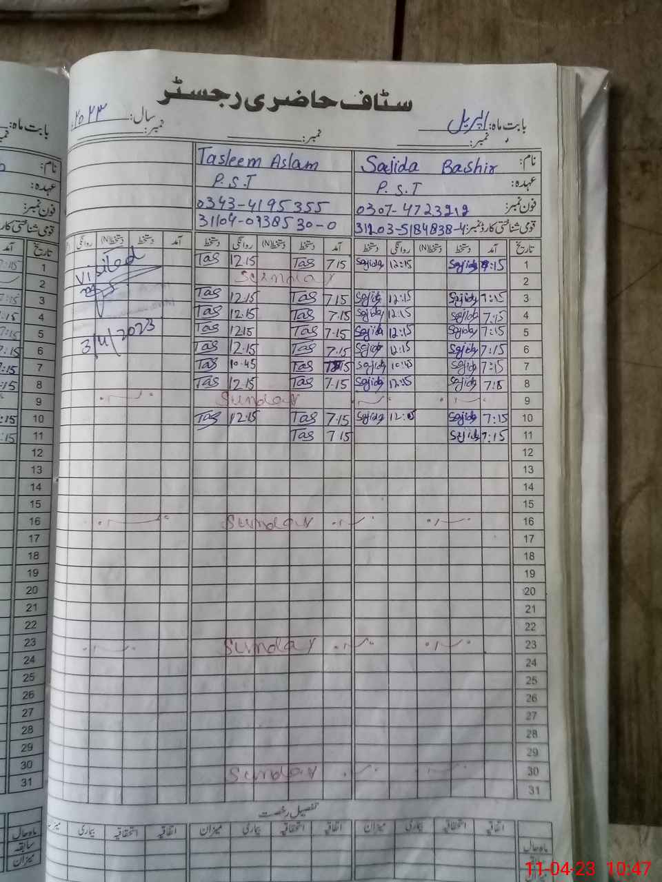 | CNIC | Full Name | Designation | R/C | Absence During Last Calender Month |