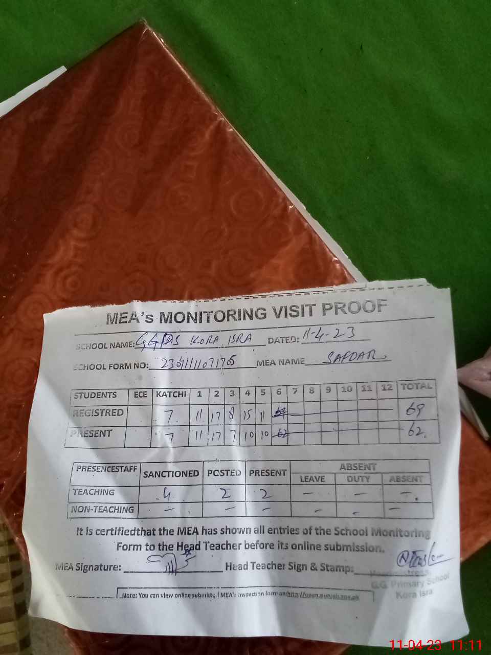 | Attendance Register | Head Teacher | MEA with School | Visit Proof |