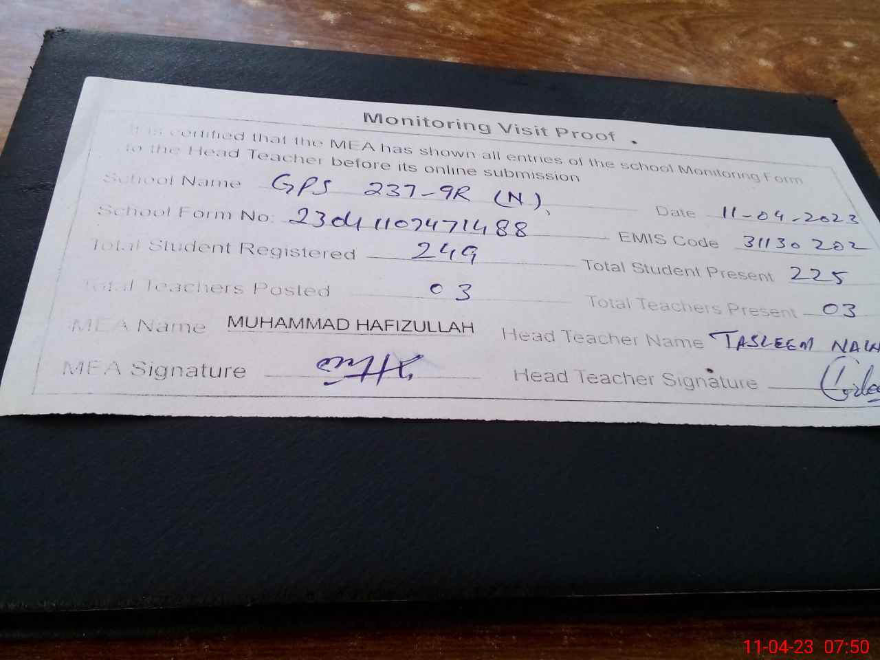 | EMIS Code: 31130202 | Name of School: GPS CHAK NO. 237/9-R NORTH | |||