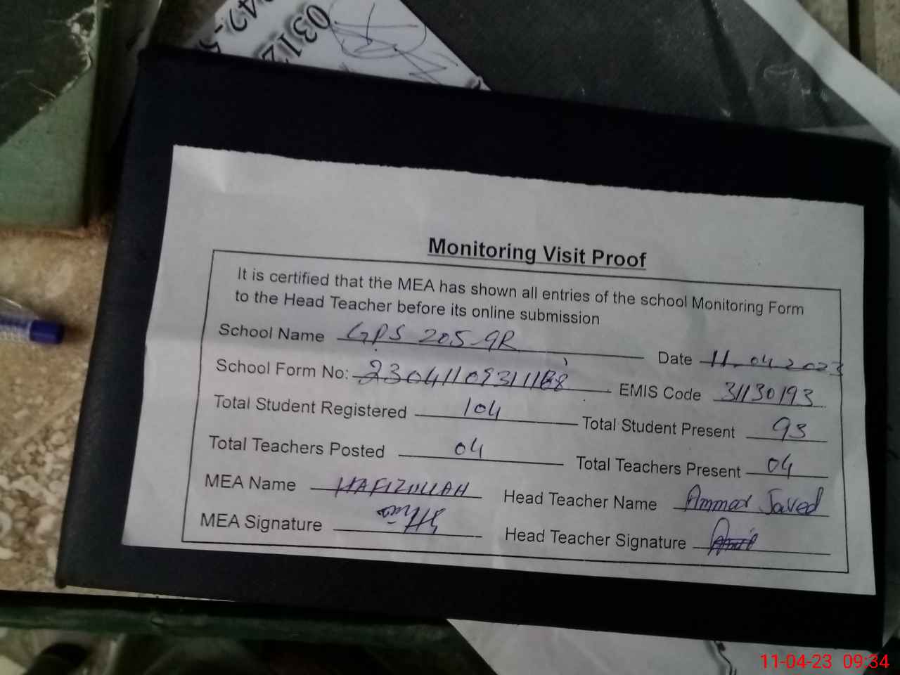 | Attendance Register | Head Teacher | MEA with School | Visit Proof |