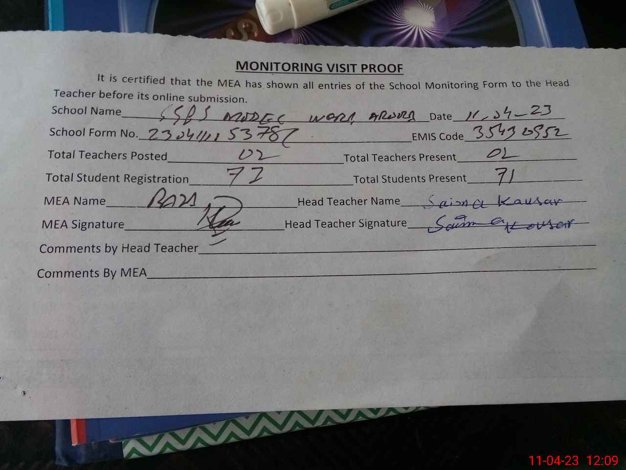 | Attendance Register | Head Teacher | MEA with School | Visit Proof |