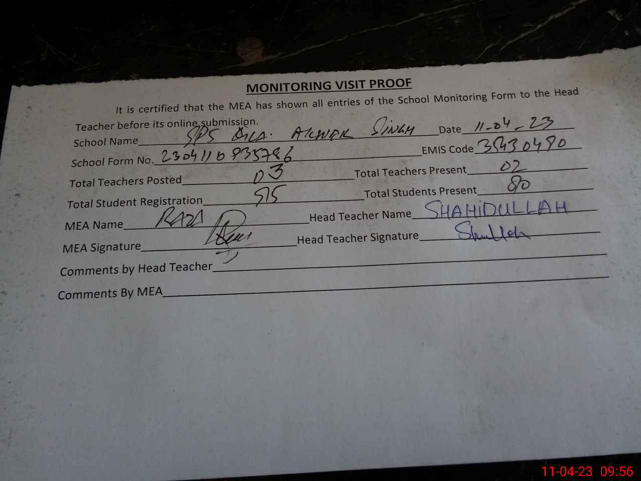 | Attendance Register | Head Teacher | MEA with School | Visit Proof |