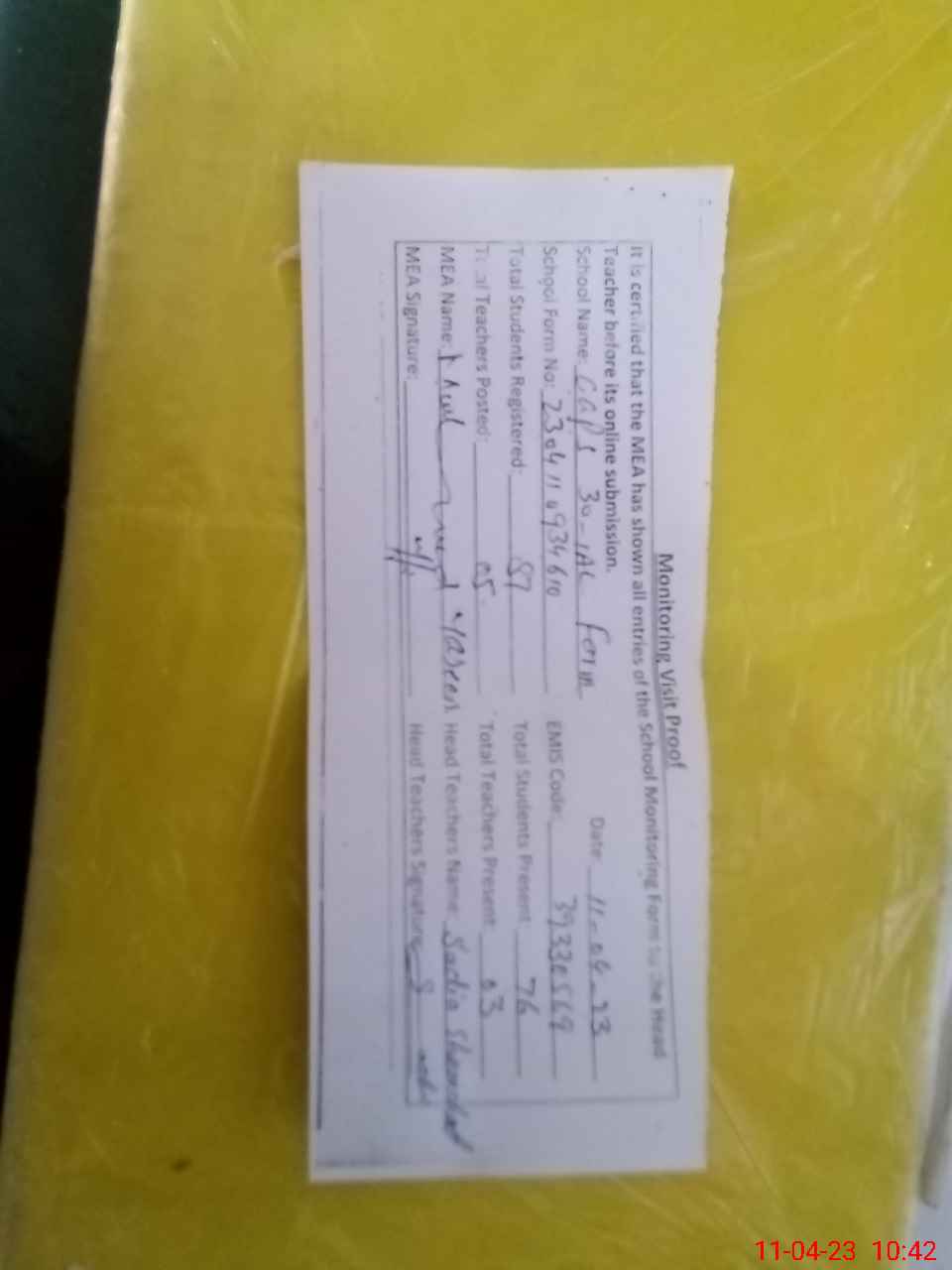 | Attendance Register | Head Teacher | MEA with School | Visit Proof |