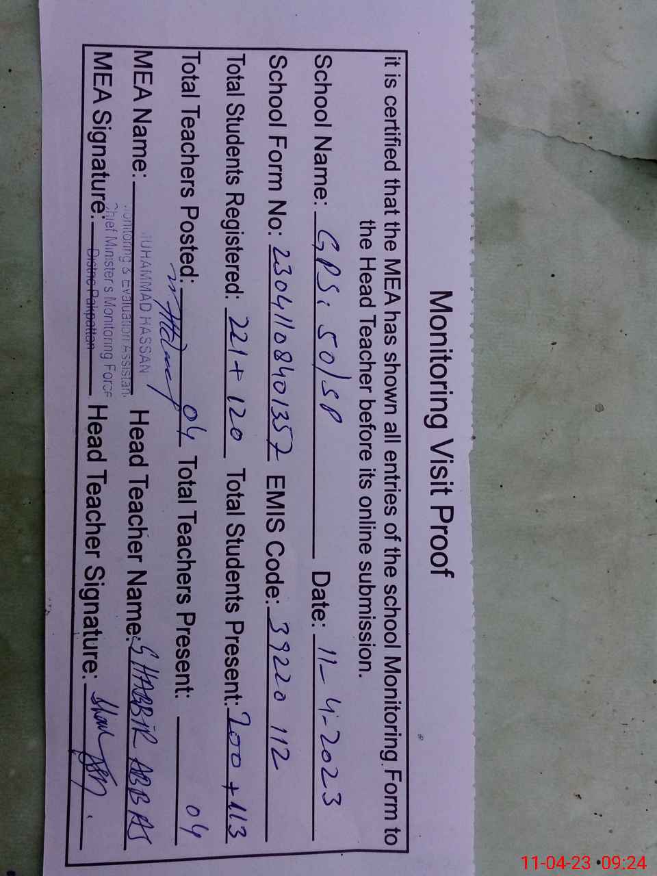 | Attendance Register | Head Teacher | MEA with School | Visit Proof |