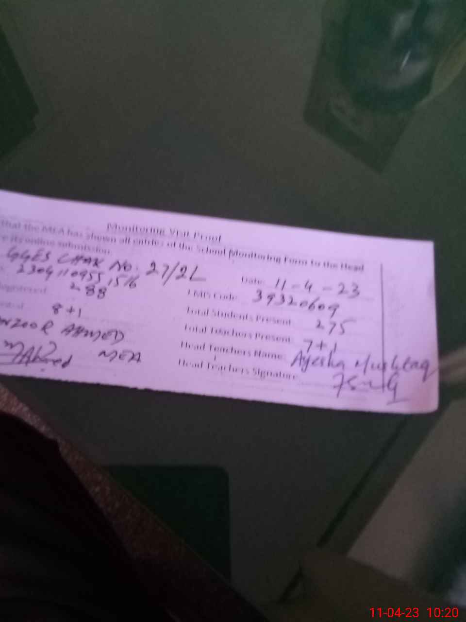 | Attendance Register | Head Teacher | MEA with School | Visit Proof |