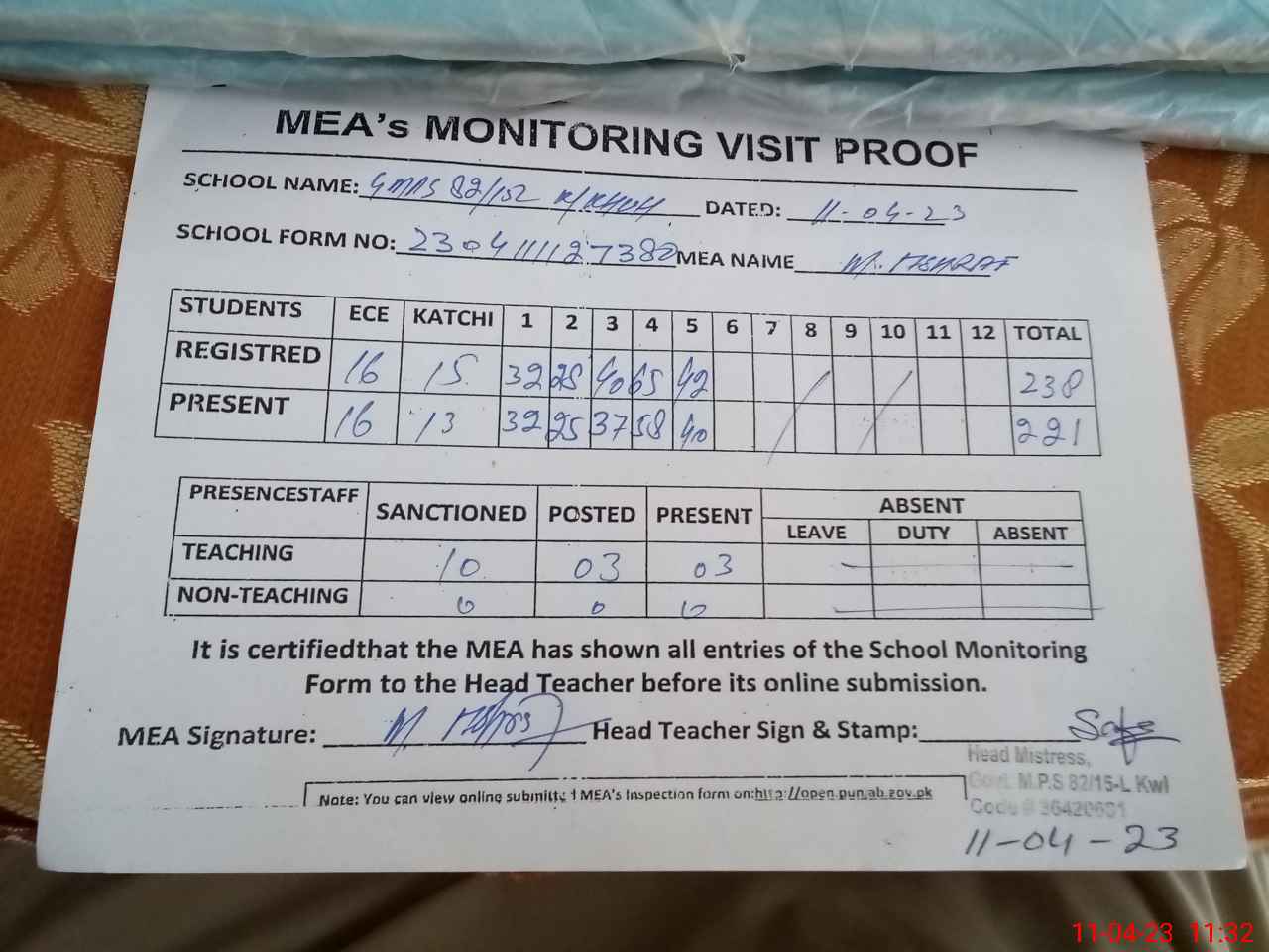 | Attendance Register | Head Teacher | MEA with School | Visit Proof |