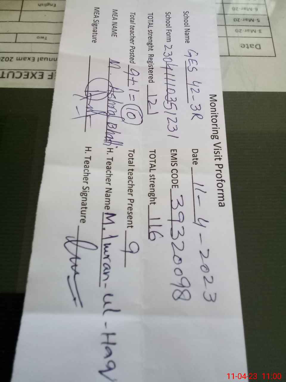| Attendance Register | Head Teacher | MEA with School | Visit Proof |