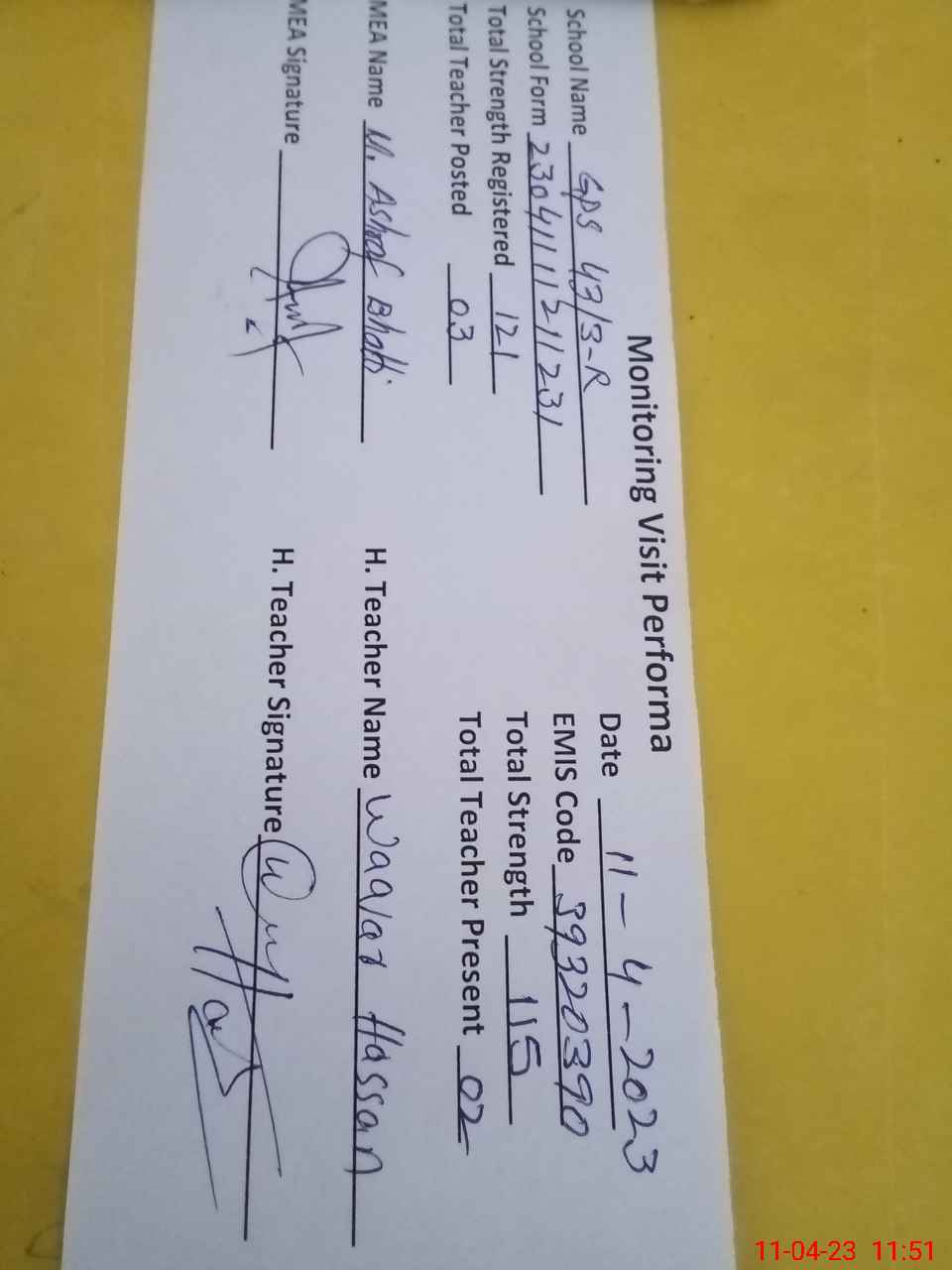 | EMIS Code: 39320390 | Name of School: GPS CHAK NO. 43/ 3-R | |||
