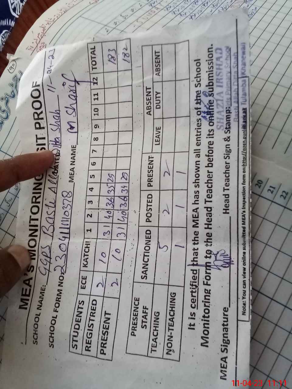 | Attendance Register | Head Teacher | MEA with School | Visit Proof |