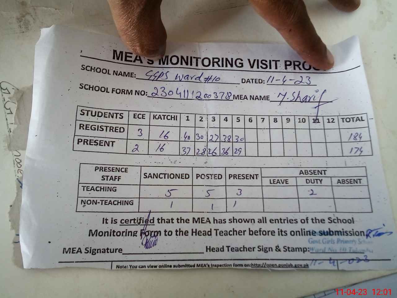 | Attendance Register | Head Teacher | MEA with School | Visit Proof |