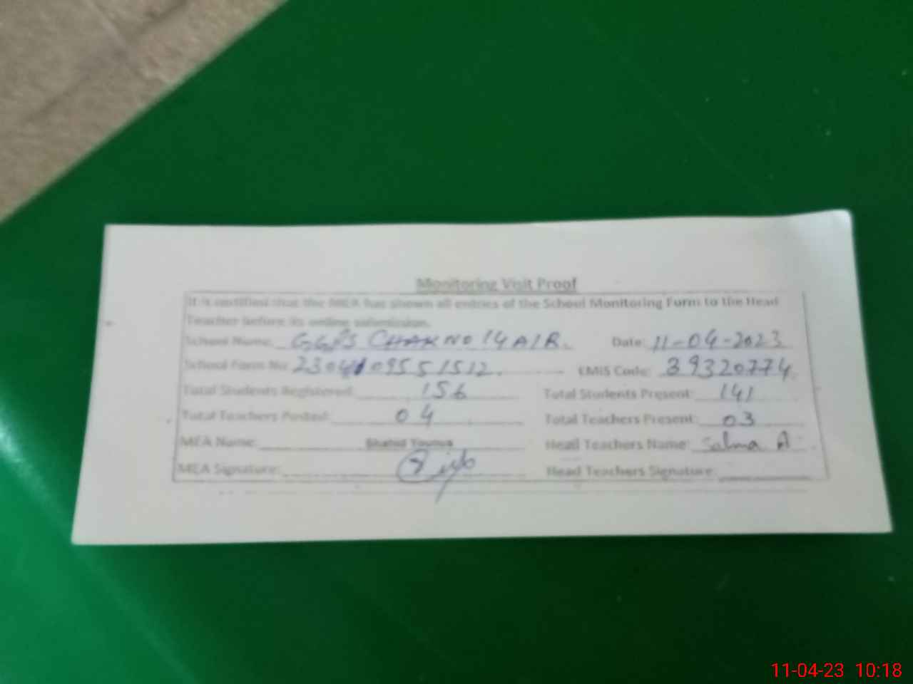 | Attendance Register | Head Teacher | MEA with School | Visit Proof |
