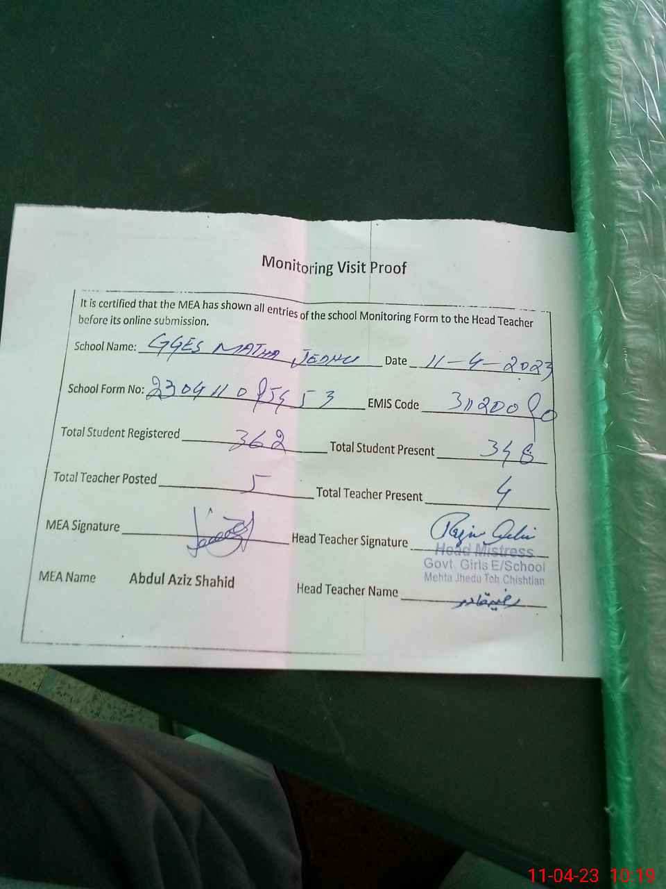 | Attendance Register | Head Teacher | MEA with School | Visit Proof |