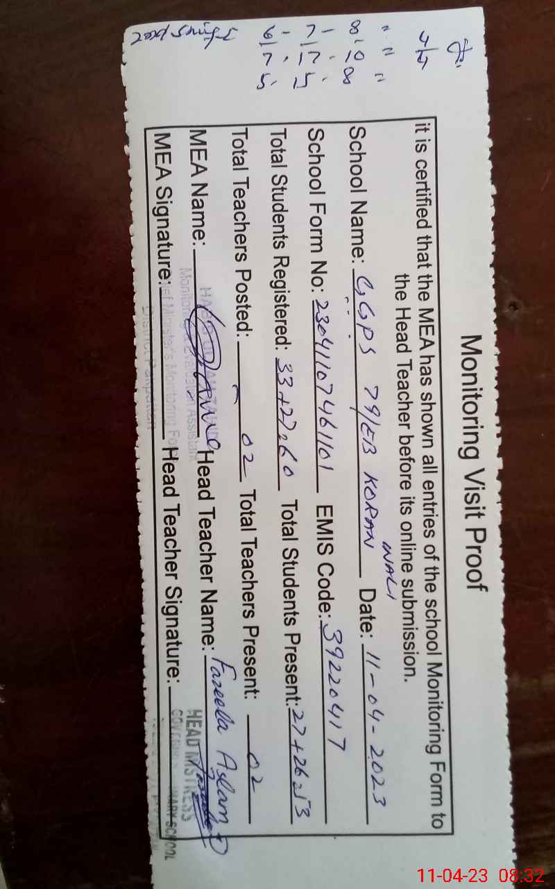 | EMIS Code: 39220417 | Name of School: GGPS 79 / EB NO.2 KORAN WALI BASTI P.O 69 EB | |||