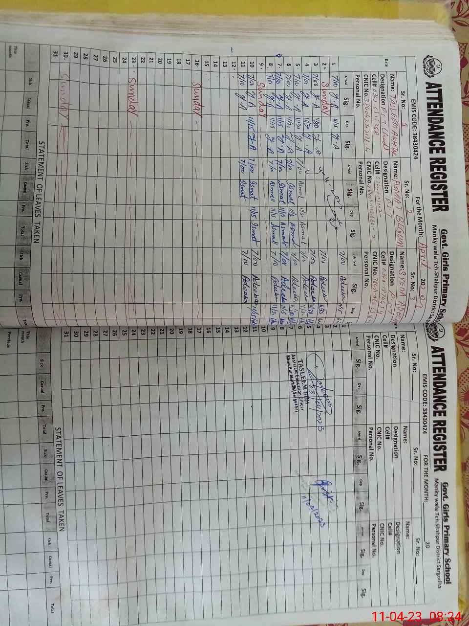 | CNIC | Full Name | Designation | R/C | Absence During Last Calender Month |