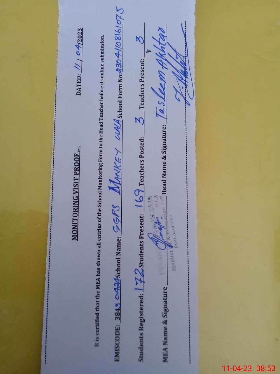 | Attendance Register | Head Teacher | MEA with School | Visit Proof |