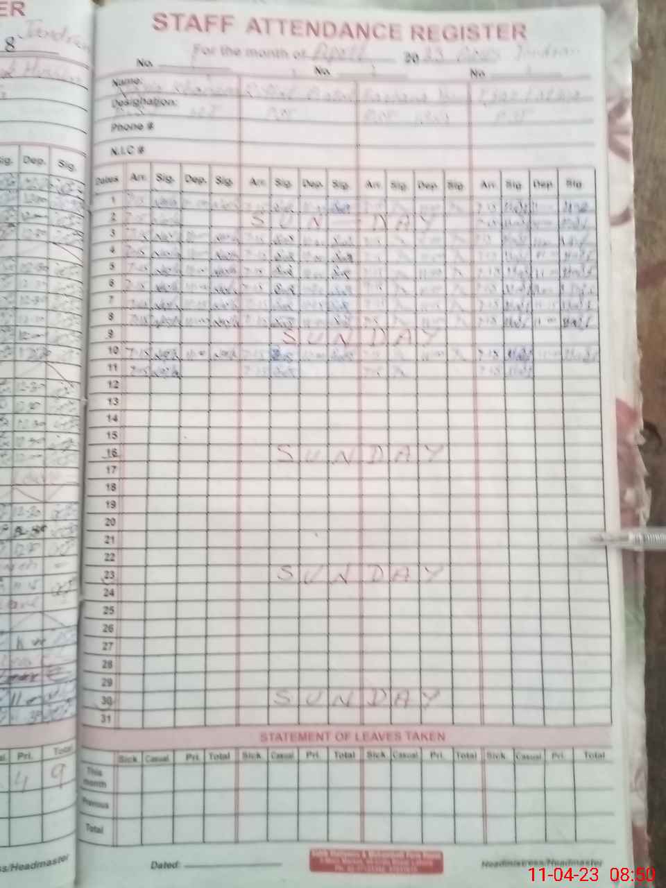 | CNIC | Full Name | Designation | R/C | Absence During Last Calender Month |