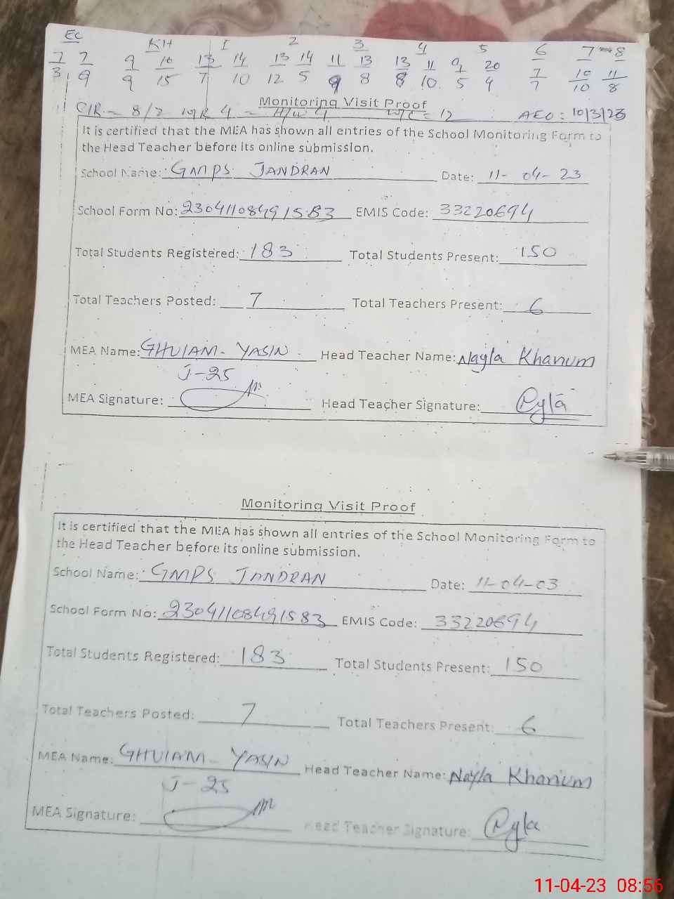 | Attendance Register | Head Teacher | MEA with School | Visit Proof |