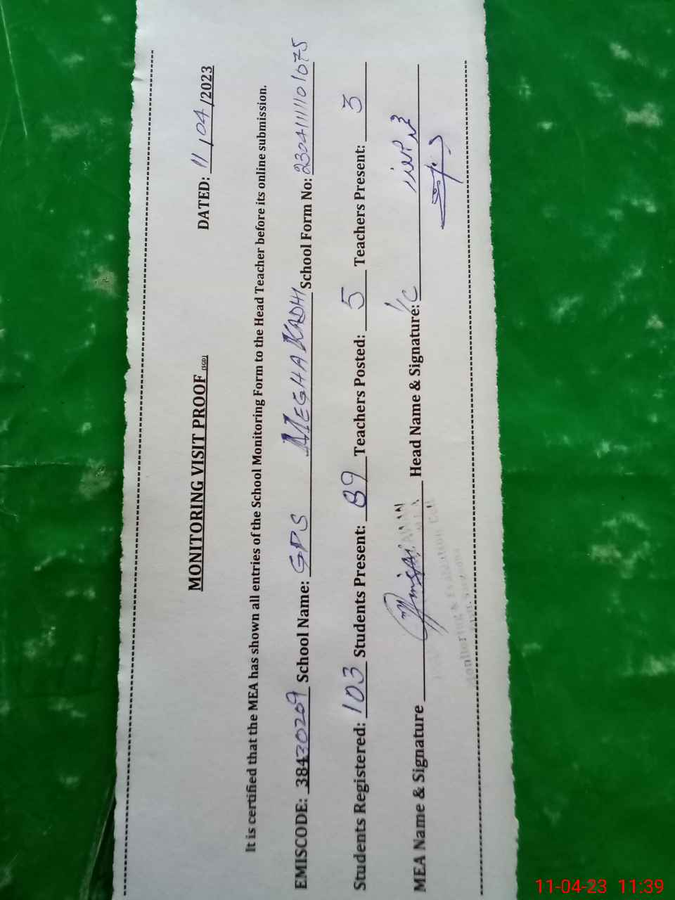 | Attendance Register | Head Teacher | MEA with School | Visit Proof |