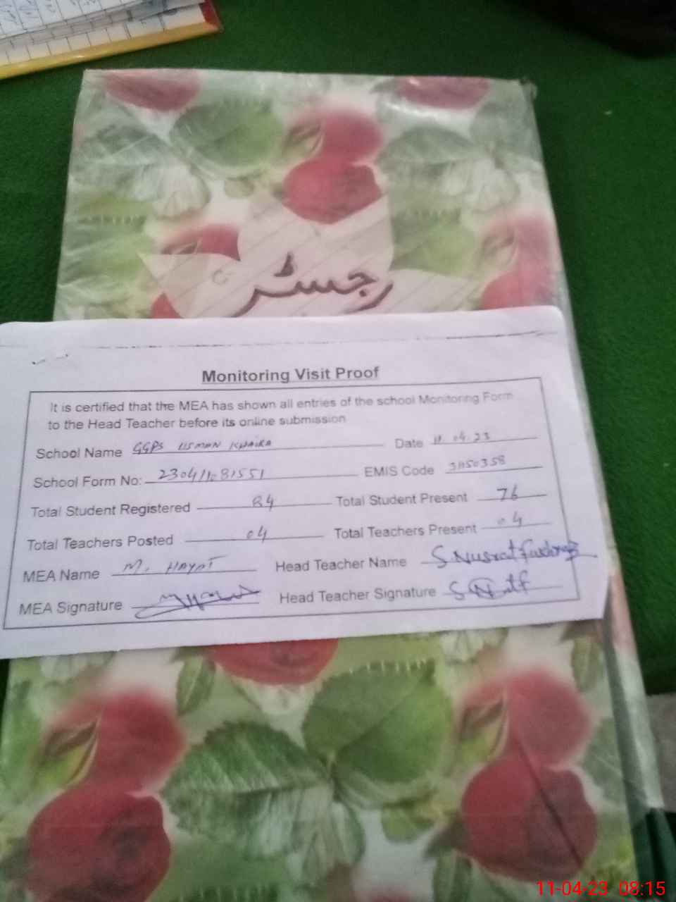 | Attendance Register | Head Teacher | MEA with School | Visit Proof |