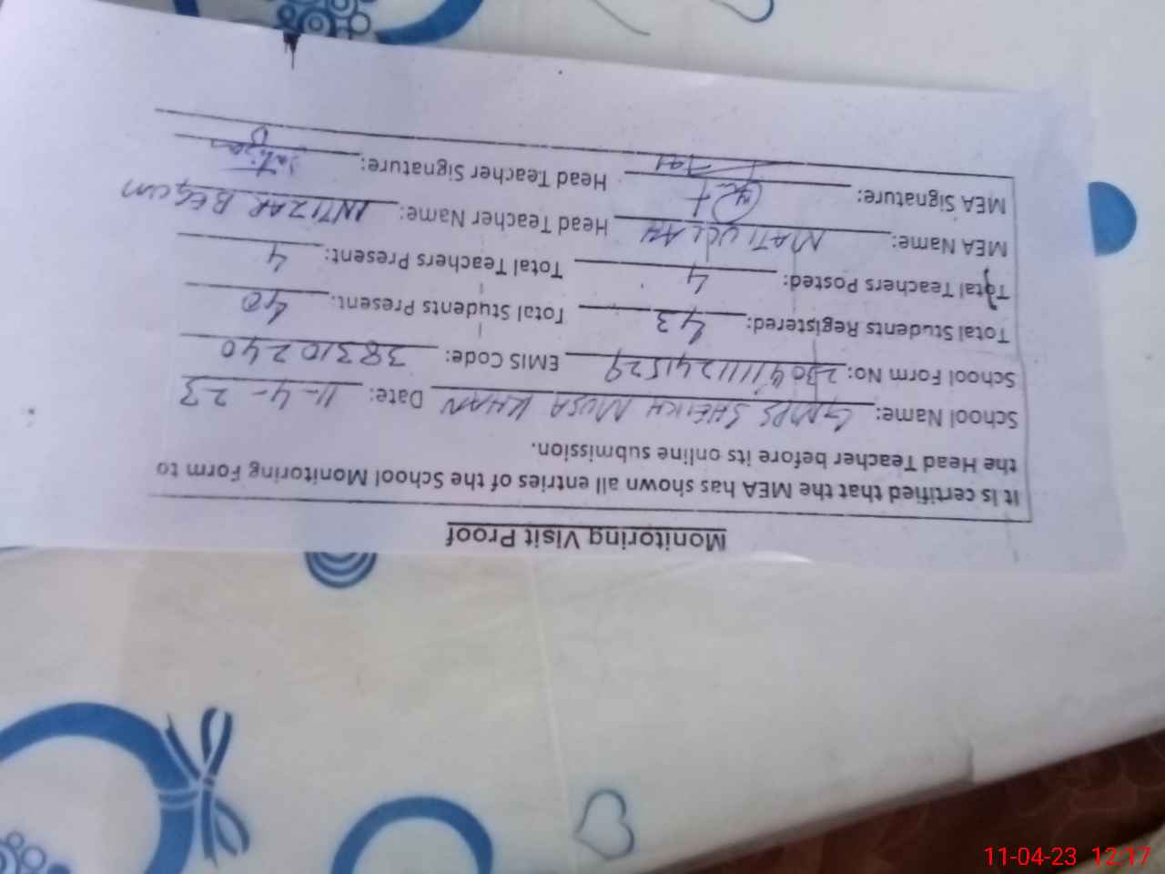 | Attendance Register | Head Teacher | MEA with School | Visit Proof |