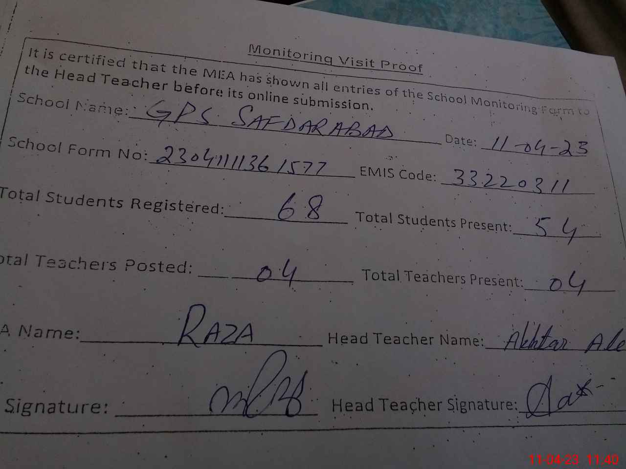| EMIS Code: 33220311 | Name of School: GPS SAFDAR ABAD | |||
