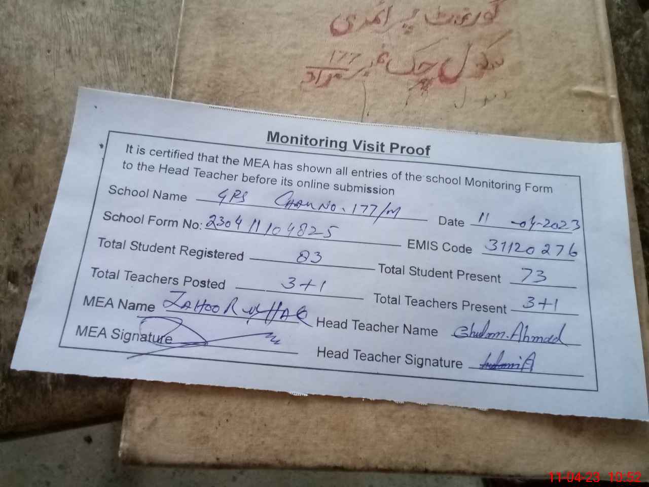 | Attendance Register | Head Teacher | MEA with School | Visit Proof |