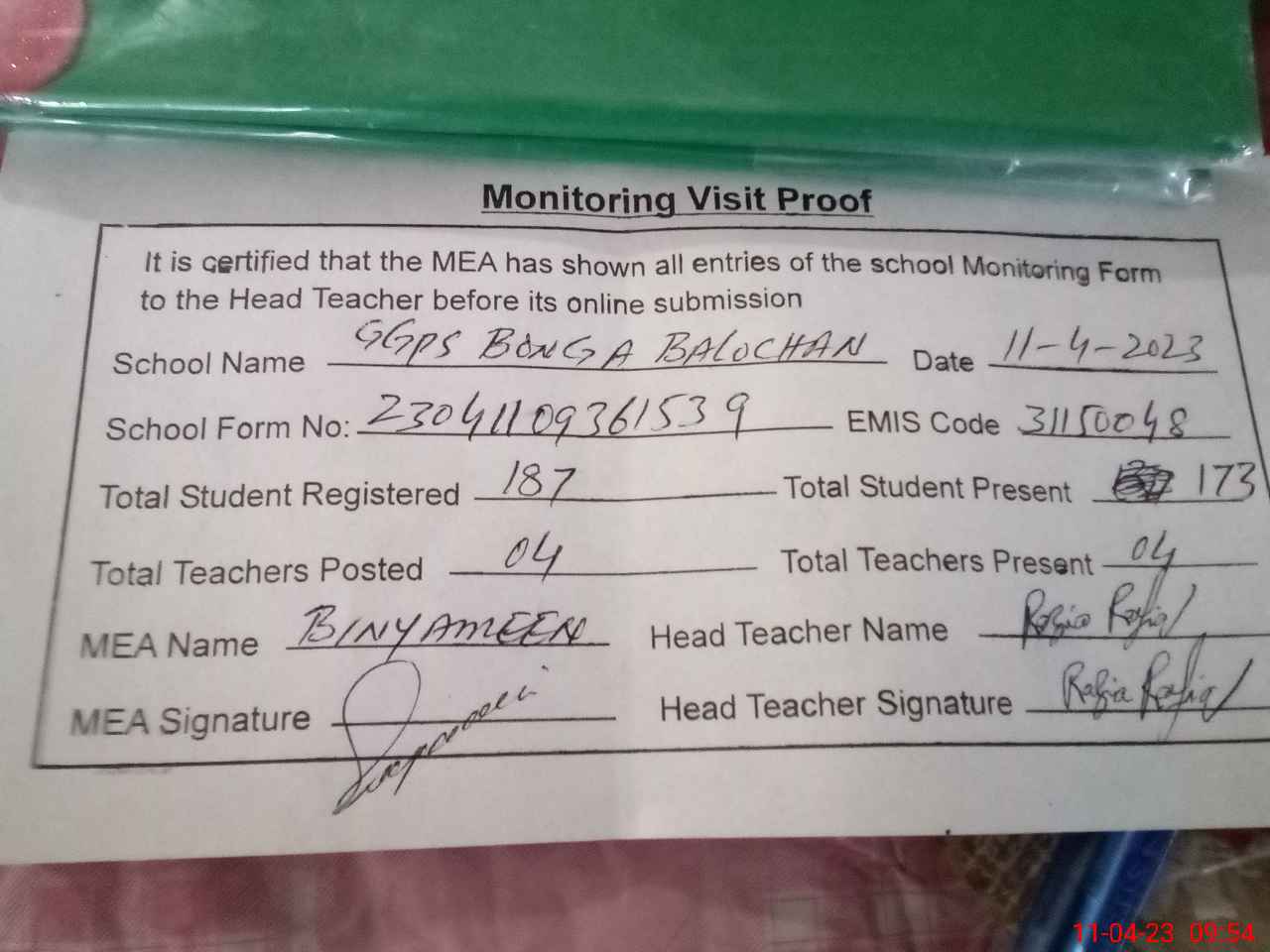 | EMIS Code: 31150048 | Name of School: GGPS BONGA BALOCHAAN | |||