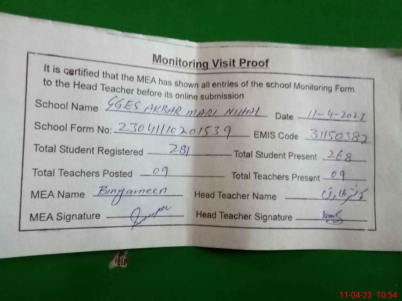 | Attendance Register | Head Teacher | MEA with School | Visit Proof |