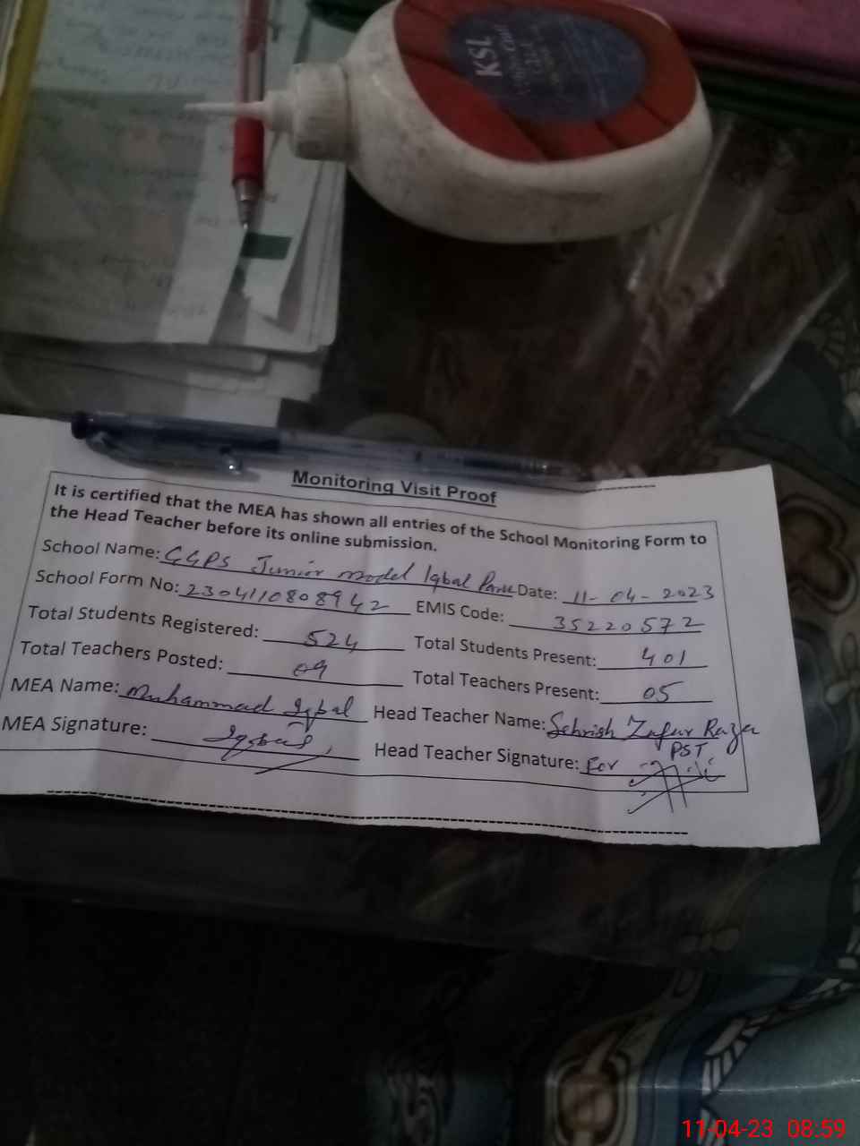| Attendance Register | Head Teacher | MEA with School | Visit Proof |