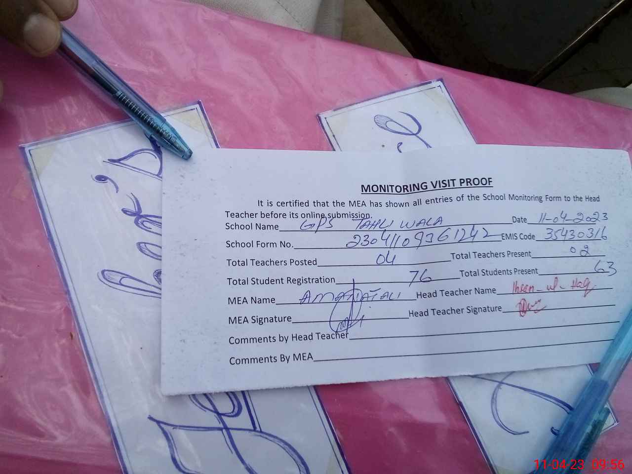 | Attendance Register | Head Teacher | MEA with School | Visit Proof |