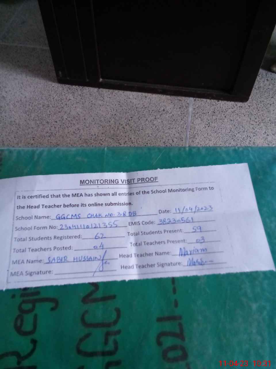 | EMIS Code: 38230561 | Name of School: GGCMS CHAK NO.38 DB | |||